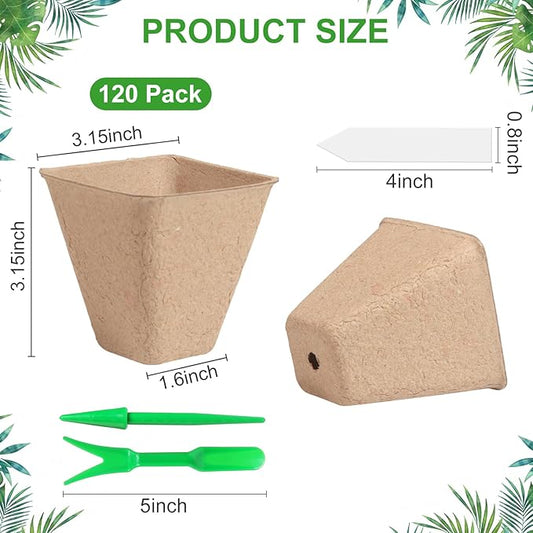120 Pack 3.15 Inch Square Peat Pots for Seedlings, Seed Starting Pots with Drainage Holes Nursery Pot, Herb Seed Starter Pot Kits wit 30 Plant Labels, 2 Transplant Tools.