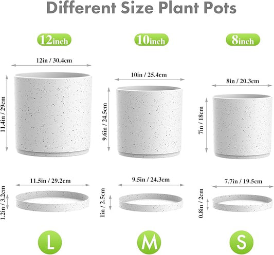 12/10/8 inch Large Plant Pots, 3 Pack Cylinder Deep Flower Pots for Outdoor Indoor Plants, Tall Plastic Planters with Drainage Holes and Saucers for Garden House Plants, Speckled White