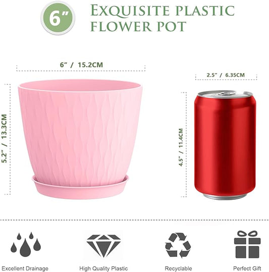 6 inch Flower Pots, 5 Pack Plant Pots with Drainage Holes and Saucers for Indoor Plants, Plastic Planters with Water Ripple for Small Garden House Plants, Nursery Pots for Succulent, Colorful