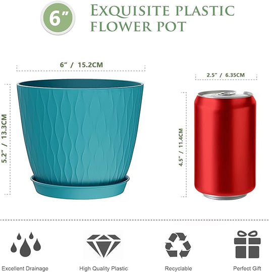 6 inch Plant Pots, 5 Pack Flower Pots with Drainage Holes and Saucers for Indoor Plants, Plastic Planters with Water Ripple for Small Garden House Plants, Nursery Pots for Succulent, Blue Green