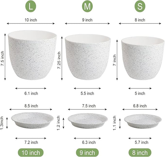 WOUSIWER Plant Pots 10/9/8 inch, Set of 3 Modern Decorative Plastic Planters with Drainage Holes and Saucers for House Plants Indoor Flowers Plants, White Speckles