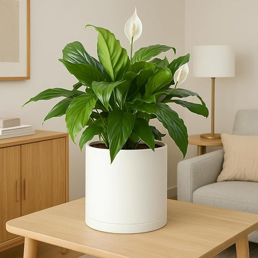 Giraffe Creation 10-Inch Round Cylinder Plant Pot, Modern Indoor/Outdoor Planter with Drainage Hole, Saucer & Water Reservoir, White