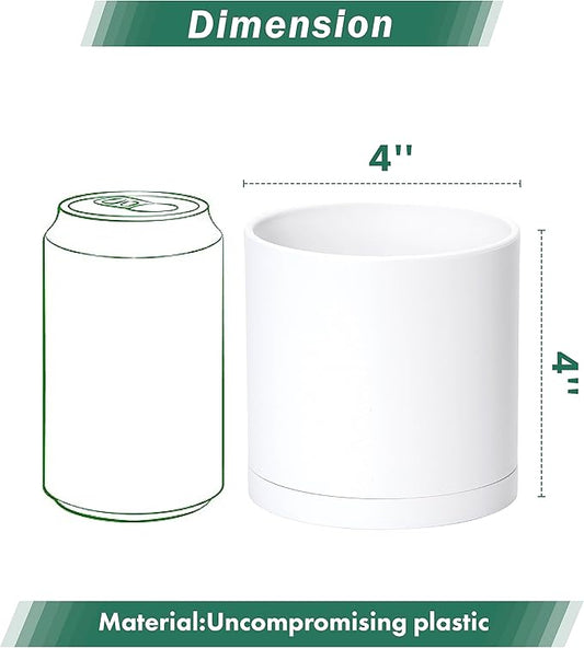 D'vine Dev 6 Pack 4 Inch Modern Plastic Plant Pots, Small Garden Planters for Plant with Drainage Holes and Saucers, White Color, 74-Z-E-3