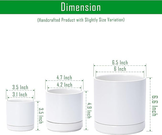 D'vine Dev 3 Inch & 4 Inch & 6 Inch, Set of 3 Round Ceramic Planter Pot with Drainage Hole and Saucer, White, 94-T-S-1