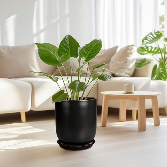 Ceramic Planter 10 Inch - Ceramic Pot for Indoor Plants Outdoor Plant Pot with Drainage Hole and Saucer Cylinder Flower Pot Black