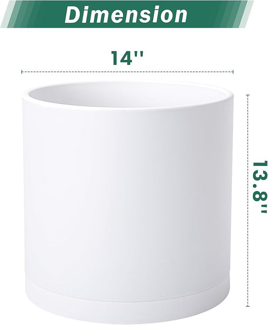 D'vine Dev 2 Pack 14 Inch Modern Plastic Plant Pots, Cylindrical Garden Planters for Plants with Drainage Holes and Saucers, White, 74-Z-Q-1