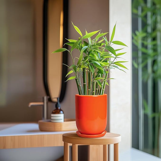 Ceramic Planter - 8 Inch Plant Pot with Drainage Hole and Saucer, Cylinder Round Modern Flower Pot for Indoor Outdoor Plants, Plant Lover Gifts, Garden Office Home Decor, Orange