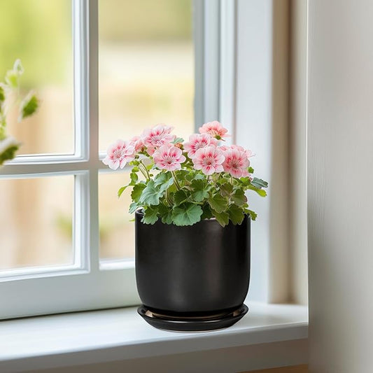 Ceramic Pot for Plants 5 Inch - Modern Round Indoor Planter for Cactus Succulent Plants with Drainage Hole and Saucer, Home Room House Office Decor, Black