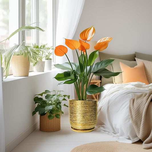Ceramic Flower Pot for Indoor Plants - 10 Inch Plant Pot with Drainage Hole and Saucer, Decorative Round Outdoor Indoor Planter, Housewarming Gifts, Home Garden Decor, Gold