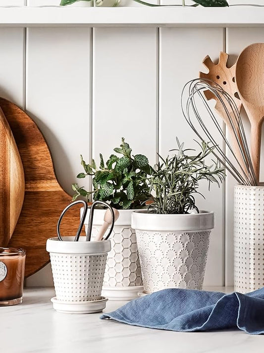LE TAUCI Ceramic Succulent Pots, 4 Inch Small Plant Pot for Indoor Plant Cactus, Embossed Flower Pots with Drainage Hole & Saucer - Set of 4, Arctic White