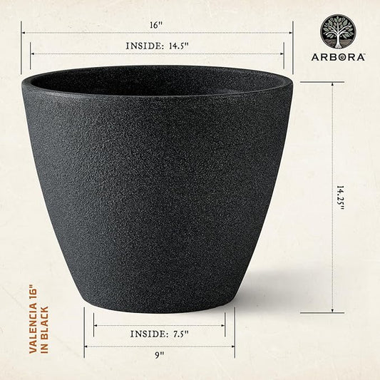 ARBORA 16" Valencia Polyresin Indoor and Outdoor Planter with Classic Black Finish - Durable, Weatherproof, Lightweight, Large Plant Pot for Patio, Garden, Deck, Entryway