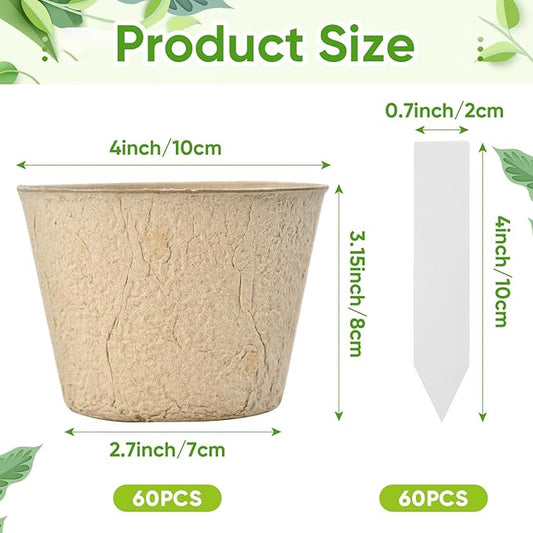 4” Peat Pots with 60Pcs Plant Labels, Biodegradable Pots for Seedlings with Drainage Holes, Garden Plant Nursery Pots Seed Starting Trays