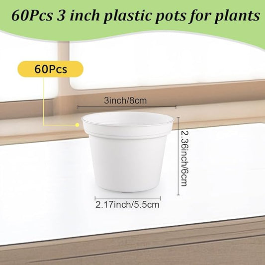 60 Pack 3 Inch White Nursery Pots - Plastic Seedling, Seed Starter, Germination Pots with Drainage for Plants, Succulents, Flowers, Transplanting Gardening Gifts