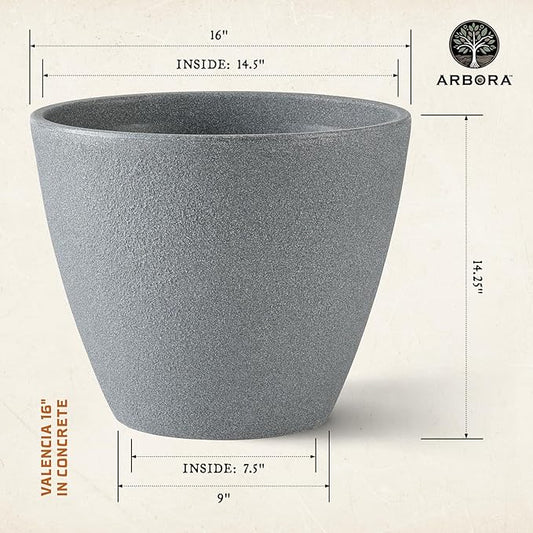 ARBORA 16" Valencia Polyresin Indoor and Outdoor Planter with Stone Blend Concrete Gray Finish - Durable, Weatherproof, Lightweight, Large Plant Pot for Patio, Garden, Deck, Entryway