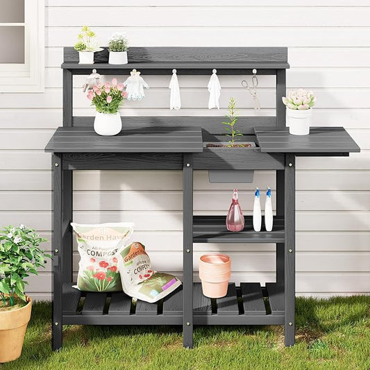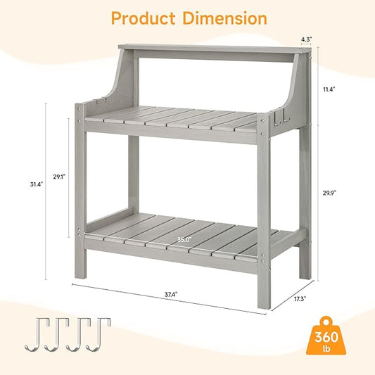 Potting Bench Table, HDPS Potting Bench with 4 Side Hooks, All-Weather Garden Table Work Station, Outdoor Potting Table for Porch, No Rust, No Fade, No Break, 360lbs Capacity (Grey, Large)