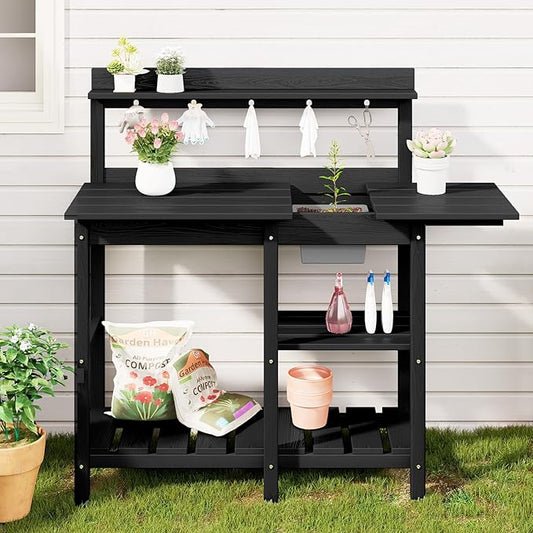 Potting Bench Table, HDPS Potting Bench with 4 Side Hooks, All-Weather Garden Table Work Station, Outdoor Potting Table for Porch, No Rust, No Fade, No Break, 360lbs Capacity (Black, Large)