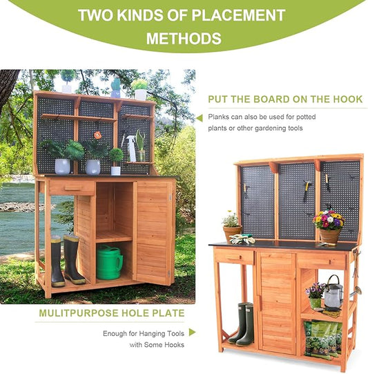 Outdoor Garden Potting Bench, Horticultural Wooden Workstation Table with Storage Drawer, Cabinet, Metal Pegboard, Adjustable Hooks and Shelves for Backyard, Patio, Greenhouse