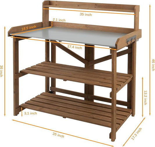 S AFSTAR Garden Potting Bench, Gardening Work Station Table with 2 Storage Shelves, Fir Wood Structure and Metal Tabletop, Gardening Table Potting Benches for Outside Backyard Balcony