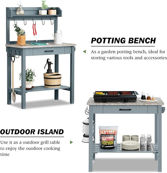 Outdoor Potting Bench Table with Metal Tabletop, Planting Table Potting Work Station with Storage Drawer and Removable Shelf Rack, Garden Potting Table for Outdoors