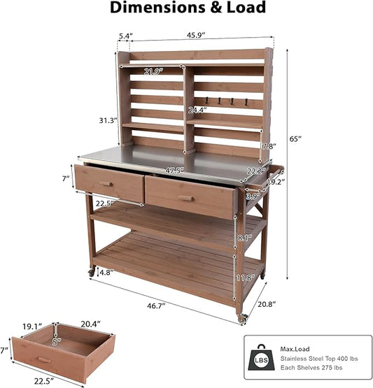 Polibi 64.9" H Outdoor Potting Bench Table with Lockable Wheels,Solid Fir Wood Outdoor Kitchen Island with Upper Hutch,Stainless Steel Top,Towel Rack,Outdoor Storage for Grilling,Lawn Garden(Brown)
