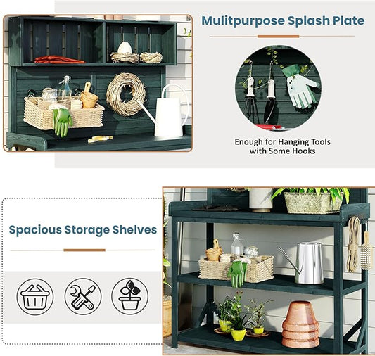 Merax 65" Large Wooden Farmhouse Rustic Outdoor Potting Bench Table with 4 Storage Shelves and Side Hook, Patio Workstation, for Garden, Backyard, Forest Green