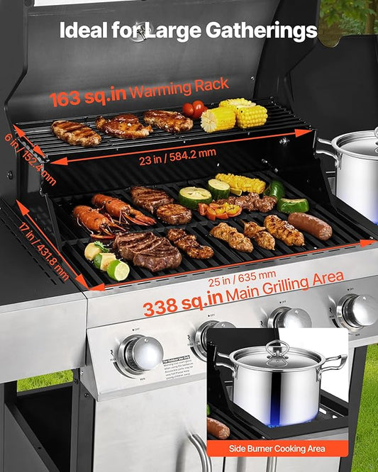 VEVOR Gas Grill, 4 Burner Propane Gas Grill with Side Burner, 425 SQ.In Grilling Area, Carbon Steel Enamel Grates, Outdoor 52,000 BTU Patio Garden BBQ Grills with Two Side Shelves, Stainless Steel