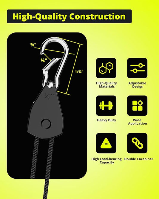 VIPARSPECTRA Retractable Heavy Duty Ratchet Tie Down Straps [4 Pack, 8ft, 75lbs/Pack], Rope Pulley System Rollers with Carabiner Hook for Kayak/Hanging Plants/Grow Light/Tents Various Tie-Down Uses