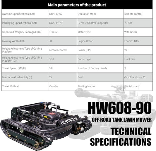 Robotic Remote Control Lawn Mower 22HP 65° Climbing Adjustable Mowing Height Track Drive All Terrain Grass Cutter Yard Mower (HW 608 90L)