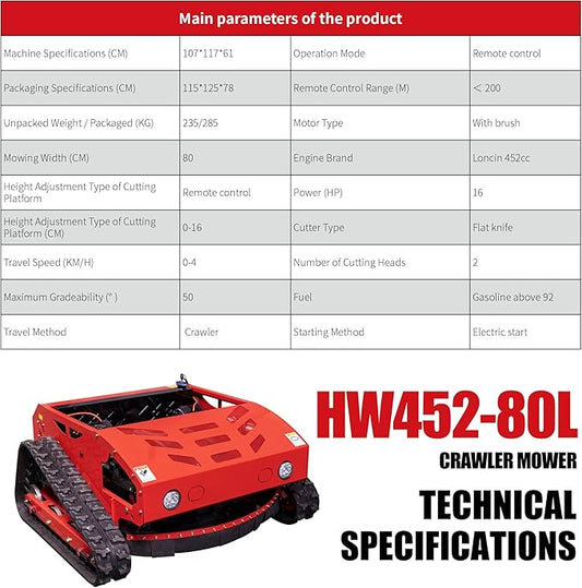 Remote Control Lawn Mower 16HP 50° Climbing Adjustable Mowing Height Track Drive All Terrain Grass Cutter Yard Mower (HW 452 80L)