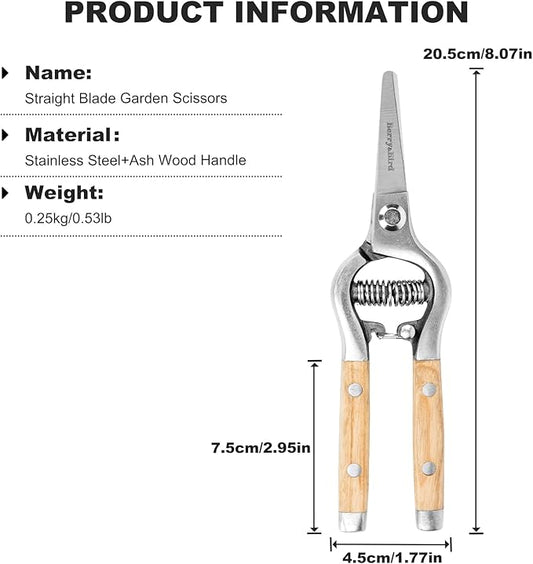 Berry&Bird Straight Pruning Shears with Stainless Steel Blades Garden Hand Pruner 8'' Scissors with Wooden Handle Clippers for Gardening Trimming Cutting Bonsai