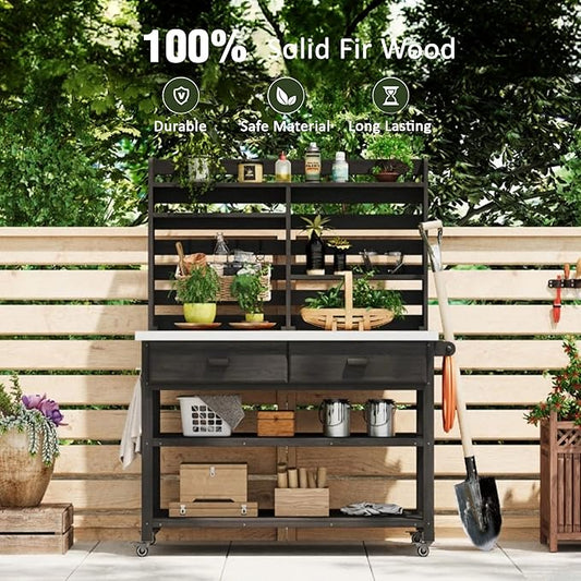 Polibi 64.9" H Outdoor Potting Bench Table with Lockable Wheels,Solid Fir Wood Outdoor Kitchen Island (Black)