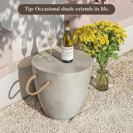 COSIEST Set of 2 Outdoor Cup Shaped Side Table, Concrete Side Table w Hemp Rope Handles,17''Patio Side Tables End Table, Outdoor Accent Table for Garden and Patio, Grey