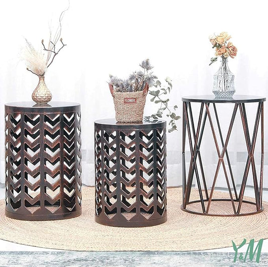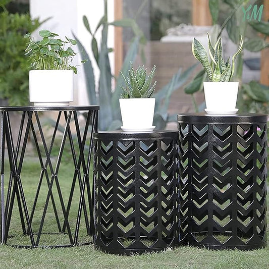 Y&M Set of 3 Black with Bronze End Tables, Nesting Metal Round Coffee Table, Heavy Duty Metal Plant Stand Garden Stool, Outdoor Multifunctional Use