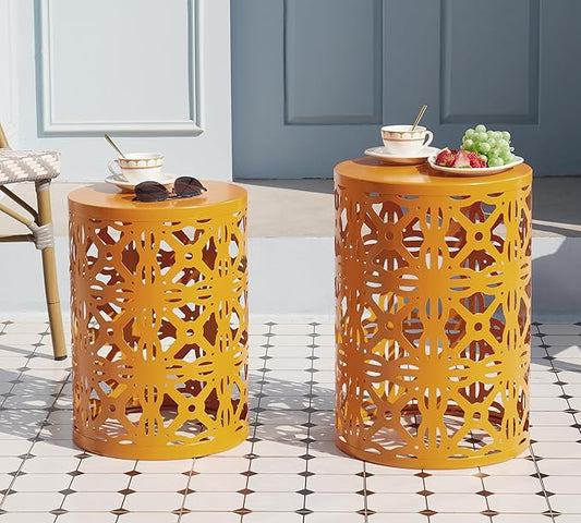 HFHOME Set of 3 Metal Outdoor Side Table, Nesting Round Coffee Table for Indoor Outdoor, Heavy Duty End Tables Plant Stand Living Room Garden Stool - Orange