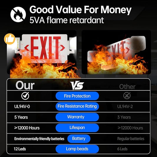 2 Packs UL Listed- Led Red Exit Sign Emergency Light Combo- Two LED Adjustable Head Emergency Exit Lights with Battery Backup- ABS Fire Resistance 120-277V-Double Face-Exit Sign for Business