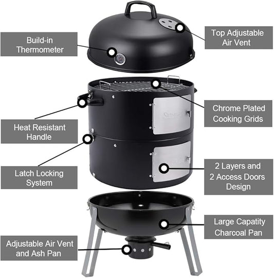 16 Inch Charcoal Smoker, 3-in-1 Meat Smoker Grill with Thermometer & Dual Cooking Racks Portable Outdoor BBQ Smoker with 2 Access Doors, Easy to Clean, for Backyard, Camping & Parties