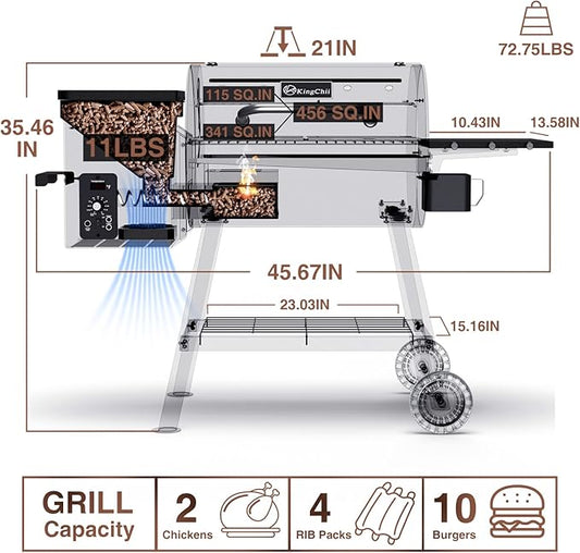 KingChii Electric Wood Pellet Grill & Smoker with Side Shelf, 456 SQ.IN Grill Capacity, with PID Temperature Control (180-425°F) for Backyard Camping Bake and Roast, Black