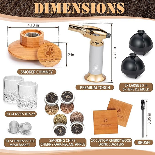 Old Fashioned Cocktail Smoker Kit for Whiskey, Bourbon, and Drinks with Cherry Smoker, Natural Wood Chip Flavors, Culinary Torch, Ice Cube Spheres, 2 Coasters, 2 Glasses