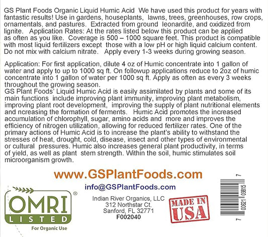 GS Plant Foods Organic Liquid Humic Acid with Fulvic - Concentrate Fertilizer for Enhanced Nutrient Uptake and Soil Conditioning - 1 Gallon