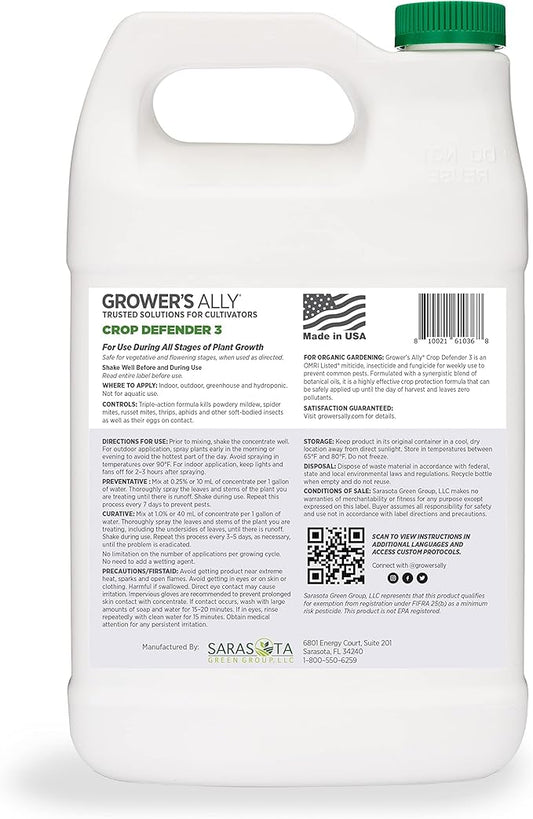Grower's Ally Crop Defender 3 Concentrate 1 gal | Natural, Safe & Organic Insecticide & Fungicide Control for Plants - Powdery Mildew, Spider Mites & Russet Mite Killer