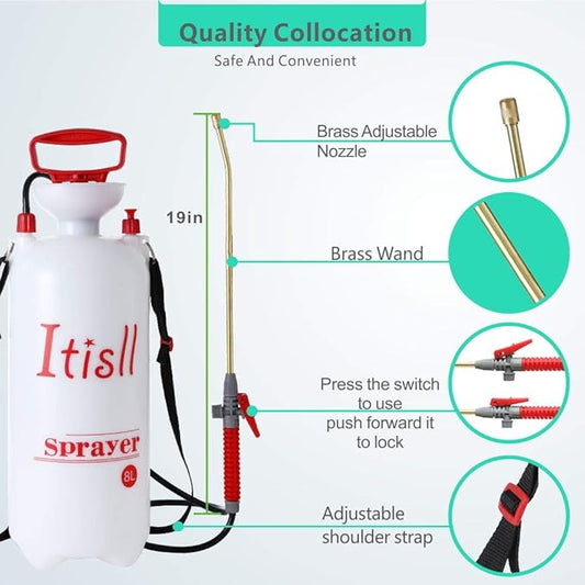 Itisll Portable Garden Pump Sprayer Brass Wand Shoulder Strap for Yard Lawn Weeds Plants 2Gal