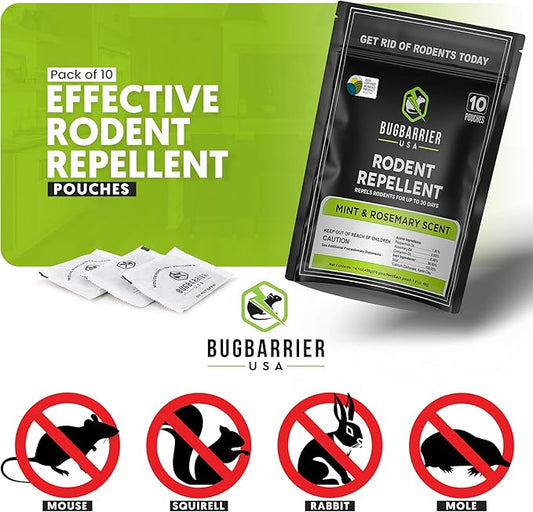 BugBarrier's Extra-Strength Mouse Repellent Deterrent Pouches, USDA 99% Biobased, Peppermint & Rosemary Oils Repel Mice Nesting in Car, RV, Boat, Garage, Shed, Cabin Made in The USA (Pack of 10)