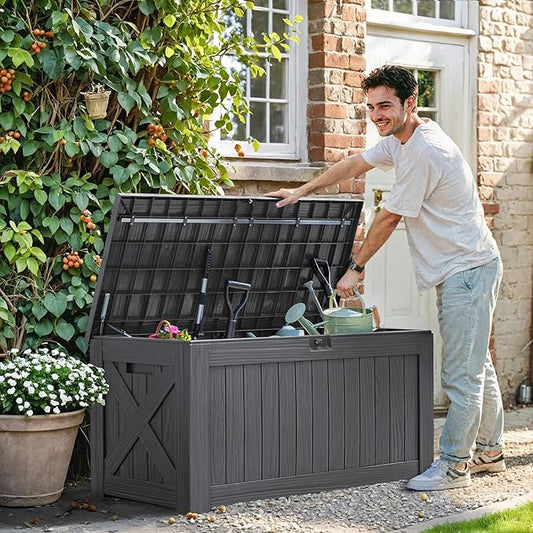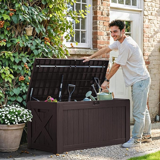 Greesum 120 Gallon Deck Box, Resin Outdoor Storage Container for Patio Furniture, Garden Tools, Pool Accessories, Weatherproof, Lockable, Coffee