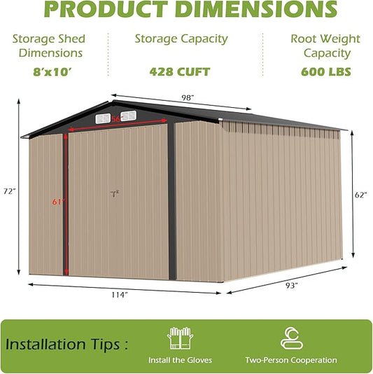 8×10 FT Metal Shed Outdoor with Peaked Roof, Weather Resistant Outdoor Storage Shed with Lockable Double Doors for Backyard, Patio Lawn, Garden