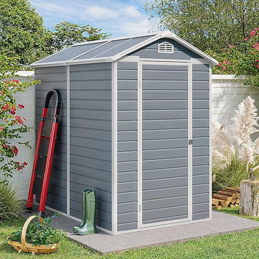 GVDV 4×6 FT Outdoor Resin Plastic Storage Shed with Reinforced Floor, All-Weather Plastic Shed with Lockable Door, Window and Vent, Waterproof Tool Storage for Garden, Backyard, Patio, Tool Storage
