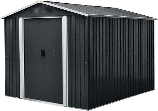 Sheds & Outdoor Storage 8ft x 10ft Metal Storage Shed with Metal Foundation, Gloves, Anchors, Tools Garden Tool Storage Cabinet with Secure Sliding Doors with Padlock for Backyard, Black
