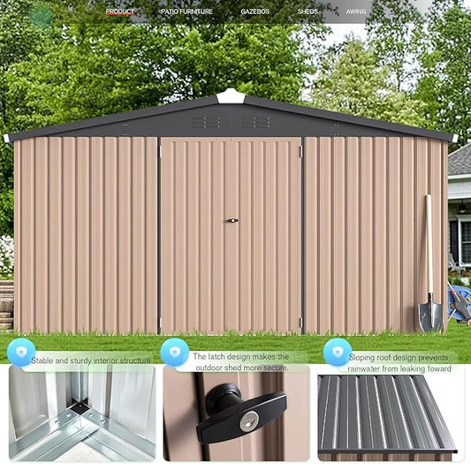 10×10 FT Outdoor Storage Shed,Metal Aluminum Waterproof Tool Sheds with Doors and Vents,Heavy-Duty Sheds Unit W/Lock and Key,for Storing Bicycles,Lawnmowers,Barbeques,Gray