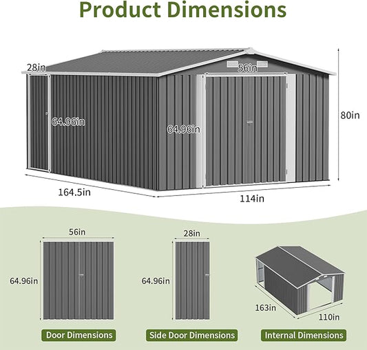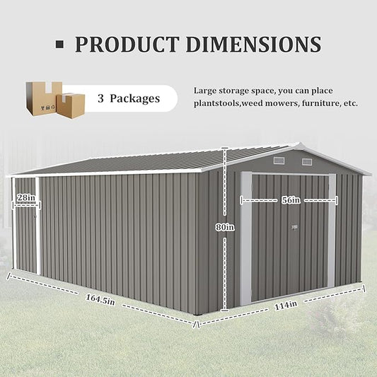 KEIKI 10x 14 FT Metal Storage Shed Outdoor, Large Garden Shed with Roof & Lockable Doors, Utility Tool Sheds Frame & 4 Vents for Patio Backyard Bicycles Storage House, All Weather Use, Light Grey