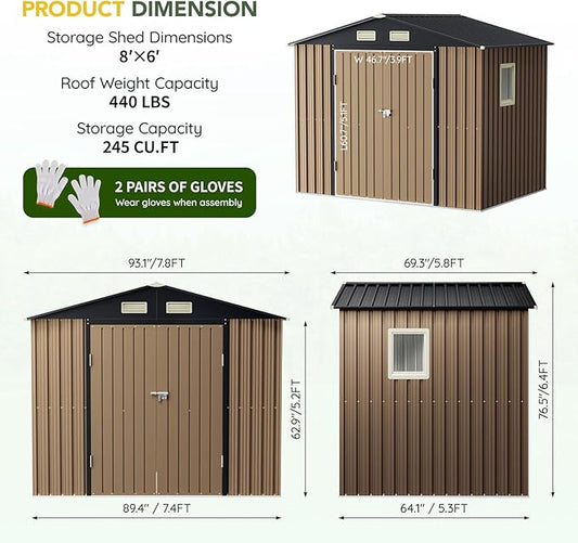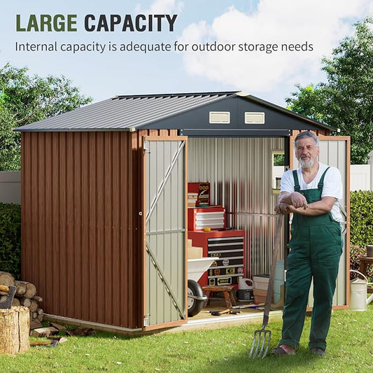 Breezz 8x6FT Outdoor Steel Storage Shed with Clear Window, Lockable Doors, Weather-Resistant Metal Tool Shed for Garden, Backyard, Patio, and Utility Storage.Brown