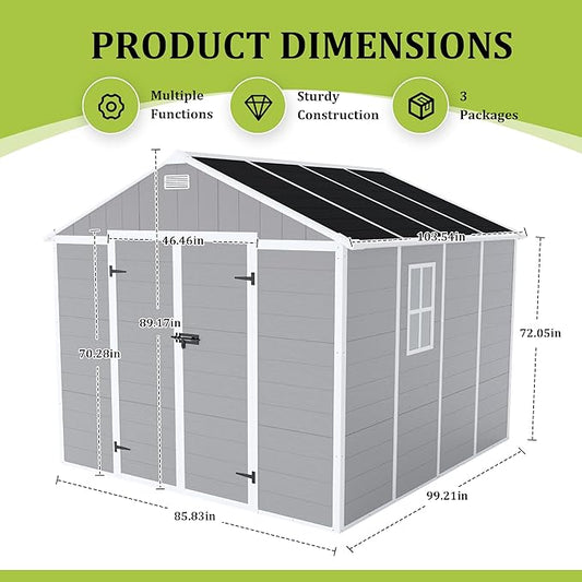 Outdoor Storage Shed 8x8 FT, Resin Shed with Floor & Window, Lockable Door, Vents, Outside Sheds & Garden Shed for Patio Furniture, Gardening Tools, Pool Equipment (Grey, 8 * 8ft)